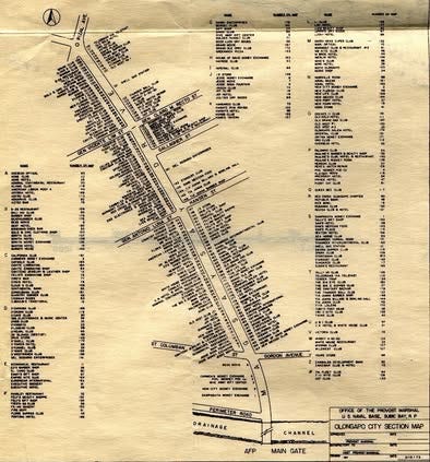 Setting the way back machine to 1974-5 thanks to a conversation last night with an old shipmate, he sent me a picture of the bar map from Olongopo, RP from 1973 (note- These were probably good for two or three days… Then somebody would change their bar’s name, and the Shore Patrol would have to go re-do it). Sorry it’s basically unreadable, and can’t be blown up any further!